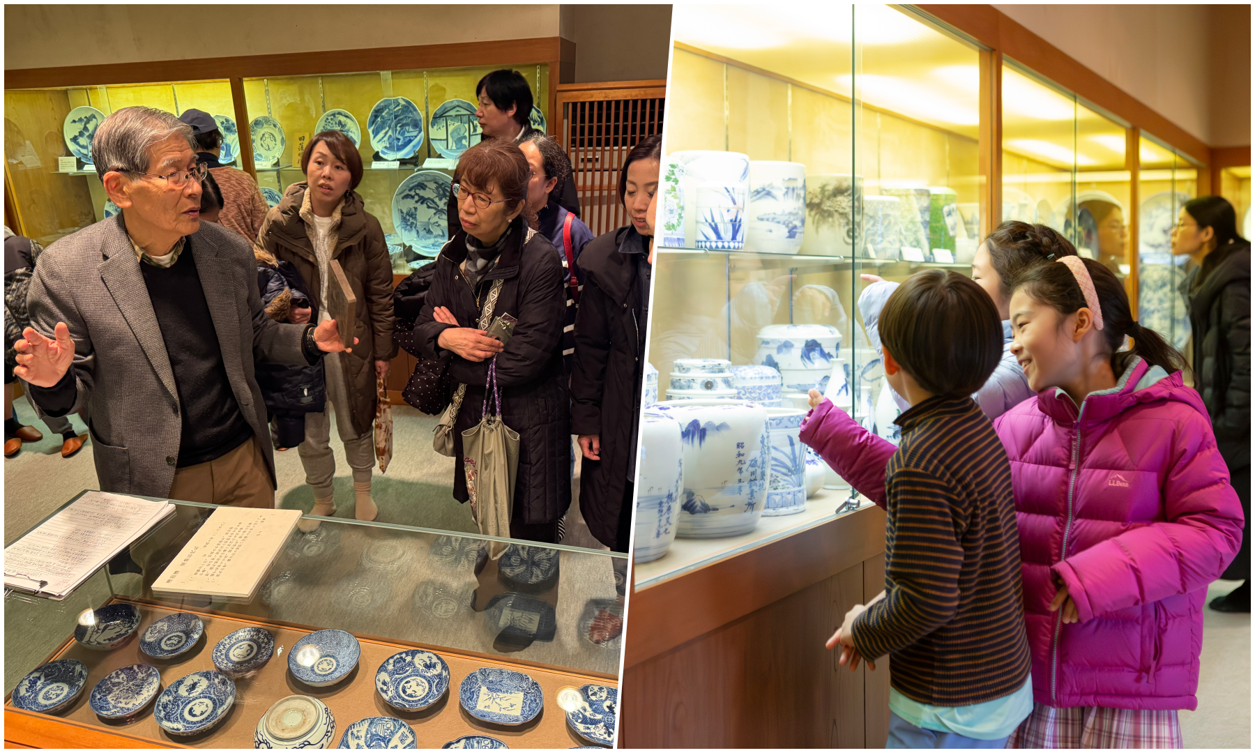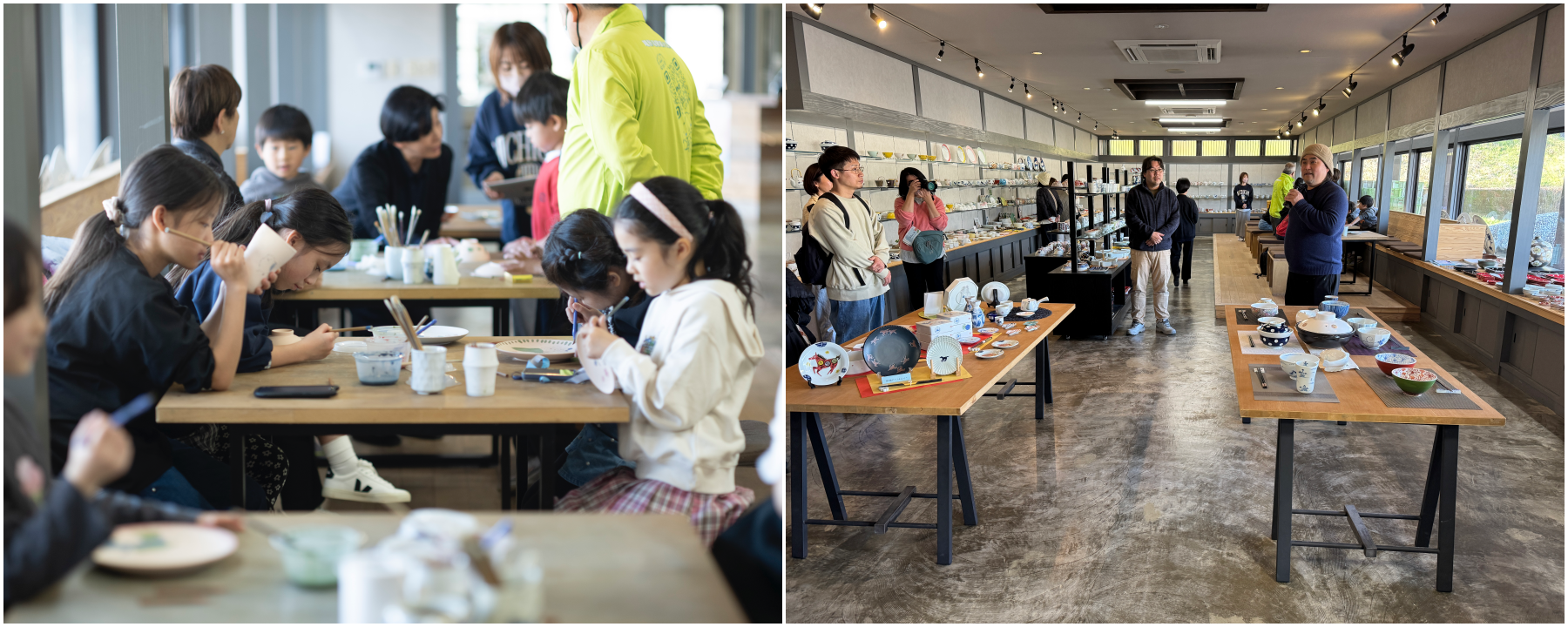 肥前吉田焼窯元会館での絵付け体験に様子(左)と実物を前に肥前吉田焼の歴史と今を学ぶ講話(右)