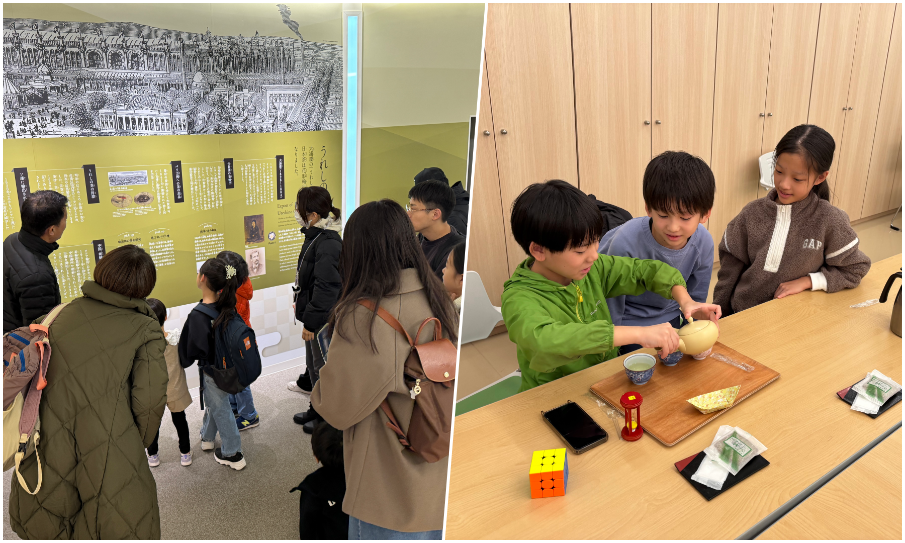 うれしの茶交流館「チャオシル」にはうれしの茶の歴史や製法を学ぶ展示があります。館長の説明でそれらを見てまわりました。また、お茶の淹れ方体験では、お湯の温度によって味が大きく変わることや成分や効能など、お茶の淹れ方について順番に体験しながら学びました。帰宅後「息子の淹れるお茶がおいしくなりました!」とのお声もいただき、子どもたちの生活の中に生きる学びとなったようです。