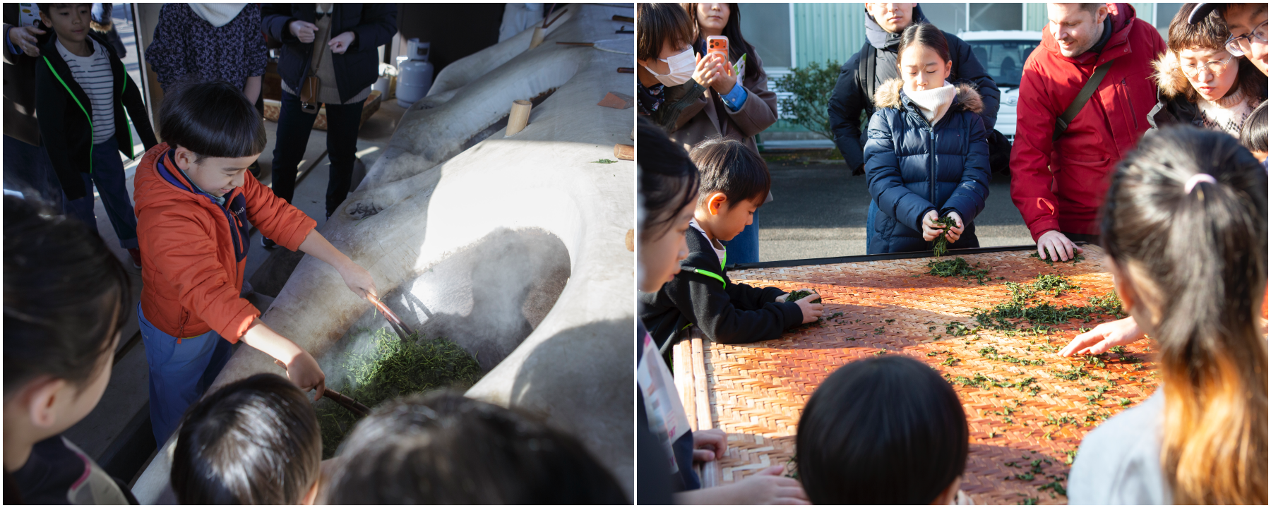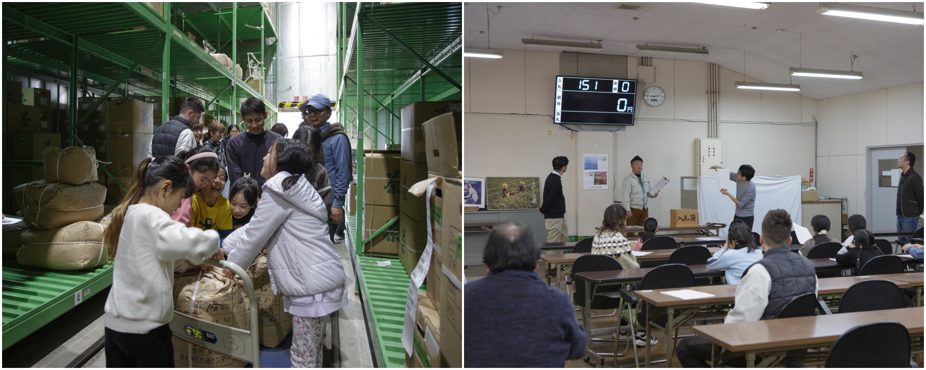 お茶の倉庫内の様子(左)とお茶のせり体験の様子(右)