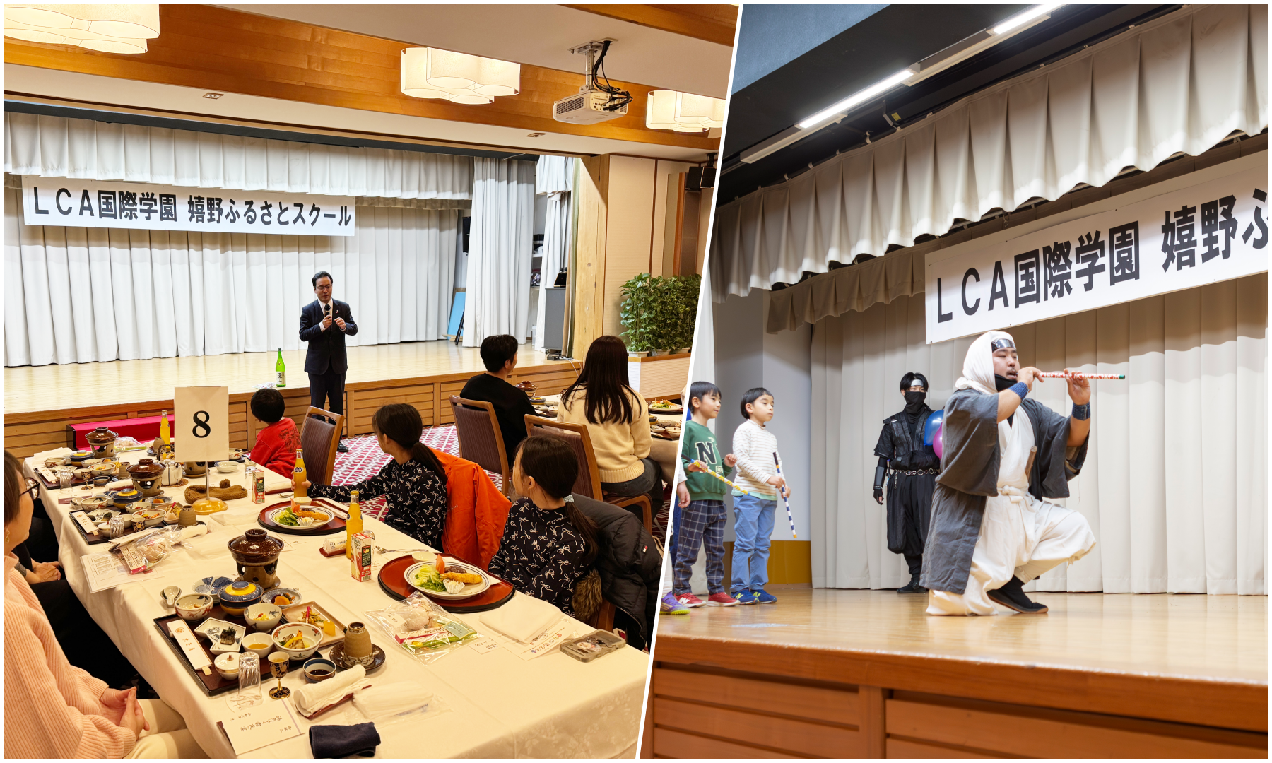 参加者の全家族と嬉野市の関係者の皆様も集まっての夕食会では嬉野市長からご挨拶をいただきました。佐賀忍者三人衆にも来てもらい、吹き矢や刀・手裏剣の使い方などさまざまな忍者の技を学びながら美味しい料理を堪能しました。