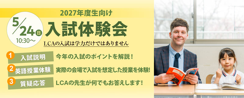 LCA国際小学校は5月24日(日)、2027年度生向け(現年長さん限定)の「入試体験会」を開催いたします。